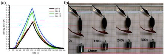 Comparing the drive time and response time of the graphene oxide/ethanol phase change actuator, we found that the drive/reduction rate ratio is 1.5, which means that the ethanol phase change actuator needs to wait 1.5 times longer for its response at the end of use. This is the same as that of no-addition. The graphene oxide/ethanol phase change actuator not only has reversible deformation properties similar to the contraction/reduction of biological muscles, but also has good driving properties. Based on this property, a simple weight-lifting experiment was designed in this paper, as shown in Figure 7b. A simple weightlifting device designed by the McKibben-type graphene oxide/ethanol phase change artificial muscle actuator can lift a 50 g weight (10 times its own weight) by 12 mm in 300 s driven by 8 V, 1 A.