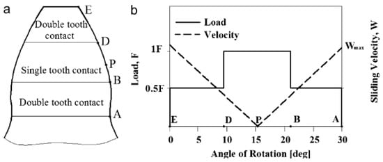Wear on a tooth surface varies depending on the sliding speeds from the dedendum to the addendum and the distribution of the load on the gear pair. According to Figure 1a, point A is the root of the tooth where the gear enters the clutch, point E is the addendum region where the gear leaves the clutch. Points D and B are the single tooth contact areas and P point is the pitch point where the speeds are equal and where wear is not observed only due to rolling. Gears make double tooth contact in E-D and A-B regions depending on the contact ratio. Therefore, in these regions the load is shared by the two teeth and wear is less in these regions (Figure 1b).