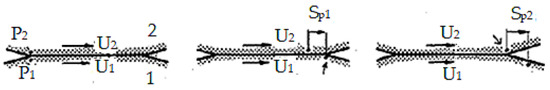 where (hp,(n − 1)) is the wear depth of point (p) in the previous cycle, (k) is the wear coefficient, (Pp,(n − 1)) is the pressure in the previous cycle, and (sp) is the sliding distance of point (p). In this equation, the movements of points such as p1 and p2 taken on both gears in contact are important in order to find the slip velocity. There are three different situations here. The first situation is when both gears engage contact simultaneously. There is no slipping distance between points at this location. In the second case, p1 disengages the contact and there is a sliding distance between p1 and p2 (Sp1). In the third case, p2 disengages the contact and there is a sliding distance between p1 and p2 (Sp2). The slip distance occurring in the second and third cases is proportional to the speed of the gears (Figure 2).