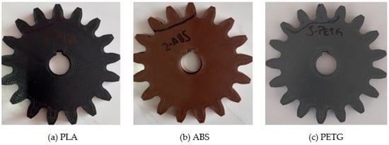PLA is obtained from materials such as corn and sugarcane. It has easy production in three-dimensional printers, low strength, and is brittle. ABS is a petroleum-based material. Its production is difficult compared with PLA. Its strength is higher when compared with PLA. PETG is higher than PLA and ABS in terms of strength. It is more difficult to manufacture than PLA. The production stages of polymeric materials produced with a three-dimensional printer and the gears produced are shown in Table 2 and Figure 3.