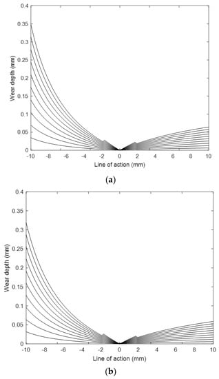 where (hp) is the wear depth in point (p), (s) is the sliding distance between contacting surfaces, (k) is the wear coefficient, and (P) is the contact pressure. If this equation is calculated according to a certain rotational speed along the contact length of any point (p) in contact: