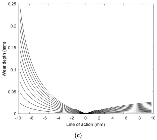 In this equation, (V) is volume of the abraded material, (s) is slippage distance between two surfaces, (K) is the friction coefficient, (W) is applied load, and (H) is the surface hardness of the material. Flodin described the Archard wear equation from the beginning to the end of the contact in the gear pair []. According to this equation: