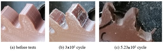 In the plastic gears produced by the FDM method, the wear was mostly observed in the tooth root region where the driving gear entered action. The critical point for plastic gears is the root region of the gears. The wear depth values calculated as a result of the theoretical equation for gears fabricated of PLA material differed by 4–5% with the results measured experimentally with the help of CMM. This shows the usability of the theoretical equation and its applicability in other plastic gears. It was observed that ABS and PLA exhibit similar wear behaviors. When all three plastic gear materials are compared, it can be said that the most durable material is PETG. The fact that PETG material is resistant to wear is due to its high elongation break and because the material is hard but flexible.