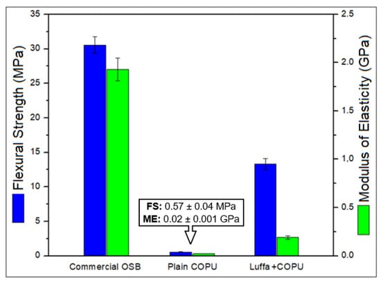The values of flexural strength (FS) and the modulus of elasticity (ME) for the three tested materials are shown in Figure 2. This figure shows that the luffa/COPU composite presented 13.3 ± 0.8 MPa for FS and 0.19 ± 0.02 GPa for ME. When analyzing the data obtained regarding the flexural properties of the materials tested, it should be noted that, due to the low performance of the plain COPU resin, the final composite, despite being 23 times more resistant to bending with the addition of luffa mat, still displayed a 50% lower performance compared to the commercial OSB. This indicates that luffa is a potentially useful reinforcement material.