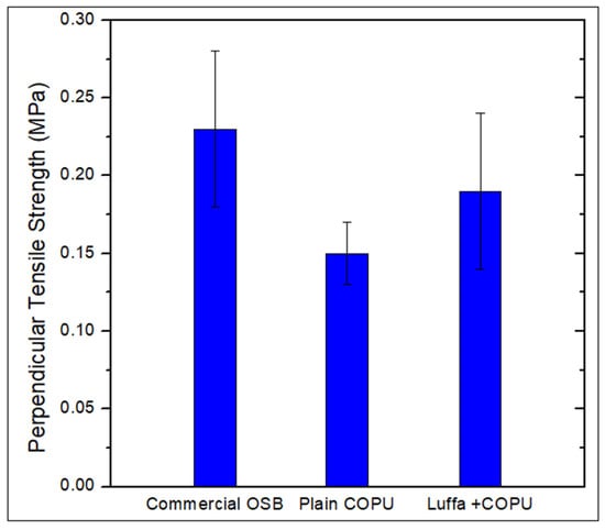 Regarding the data shown in the Figure 3, there seems to be no statistical difference between the novel luffa/COPU composite and the commercial OSB, even if there is an obvious difference between the plain COPU resin and the commercial OSB. In fact, after the analysis of variance (ANOVA) was applied, the p-value which was obtained was greater than the significance of 0.05 between the novel luffa/COPU composite and the commercial OSB. Thus, the results showed that the addition of luffa mats provided, indeed, an enhancement in performance for the plain resin. Finally, both the luffa-reinforced COPU matrix composite and the commercial OSB failed to meet the minimum requirements criteria of any of the three analyzed standards.