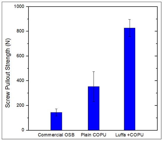 The results presented in Figure 4 affirm the good performance found for the novel developed composite. Not only was the performance better than that of the commercial OSB, but also the luffa/COPU composites presented a main screw pullout strength above the standard requirement even with thinner dimensions. Therefore, it can be affirmed that, for a thinner plate, the composite plate would present performance which is more than satisfactory for plates with double the thickness.