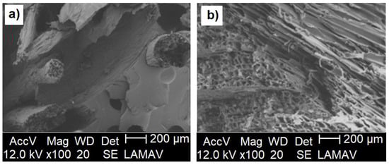 Another point that must be considered when observing the significantly higher water absorption rate of the commercial OSB compared to the luffa/COPU composite is that, in the commercial OSB, there is a volume of lignocellulosic material (wood chips) which is greater than in the luffa/COPU composite (Figure 5), which contributes to a higher rate of water absorption and swelling in thickness. This increased swelling ratio with the volume of fibers in the material is reported in the literature [,,,].