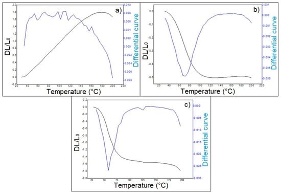 Dilatometry curves for the neat COPU resin (a), novel luffa-reinforced composite (b), and commercial OSB (c).