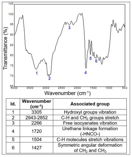 The free isocyanates (NCO) are reported in the literature to appear around 2270 cm−1 [,] and their presence is confirmed by the number 4 band at wavenumber 2266 cm−1 on the neat COPU resin spectrogram. According to some studies, the NCO groups would react with the -OH of the lignocellulosic fibers to form urethane linkages that are identified at wavenumbers around 1720–1700 cm−1 (number 4 on Figure 9) [,]. Moreover, the appearance of the free isocyanates band on the composite (band number 3) indicates that the luffa fibers interacted with the COPU, providing a minimum interface strength. Still, the composites did not present a good interface as reported by the literature [,], which justifies the performance in the perpendicular tensile strength, and impact and flexural tests performed on the luffa/COPU composite. Finally, all of the other bands expected on both the pure matrix and the composites are shown in Figure 9; these are stretch in the hydrocarbon groups commonly found in PU resin [,,] and the groups found on lignocellulosic materials such as hydroxyls and other functional groups associated with cellulose, hemicellulose, and lignin [,,,].
