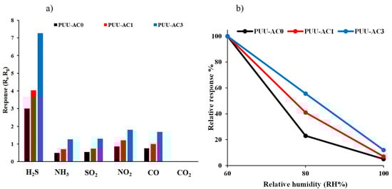 Figure 9b shows the effect of humidity on the response of the as-prepared sensors to H2S gas at 20 ppm. The relative humidity (RH) range was 60% to 100%. The response value (of 3, 4.03, and 7.27) at 40% RH was set as the standard value (100%) for PUU-AC0, PUU-AC1, and PUU-AC3, respectively. As shown in the figure, moisture negatively affects the performance of the sensors, resulting in an attenuation of more than 95% of the initial value at 100% RH.
