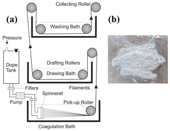 To develop fibres from different polymers, various techniques including wet spinning, gel spinning, melt spinning, and, most widely, electrospinning have been used to produce nanofibers [,]. Among these techniques, wet spinning is one of the most used techniques to develop medical fibres []. By using wet spinning technique, fibres of PVA [], PCL [], chitosan and alginate [,,], psyllium husk [,], cellulose [], polylactic acid [], silk fibroin [], polypyrrole [], and collagen [,] have been prepared. Due to its low cost, scalability, and reproducibility, as well as the fact that it is a safe and clean technique, interest in using the wet spinning technique for pharmaceutical and biomedical applications has increased [].