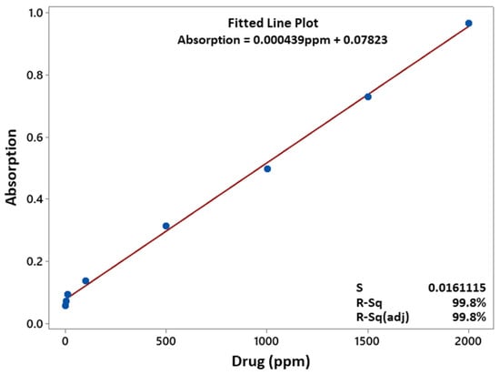 To measure the quantity of released NaSD (drug) from the developed PVA/PCL fibres with the function of time, an in vitro study of the released drug was performed. A standard absorption curve at different concentrations of the drug was developed to measure the release of the drug. A series of drug loaded standard solutions of were prepared in distilled water to obtain a calibration curve. With a slit width of 5.0 nm, a Shimadzu UV–visible spectrophotometer (UV-2450) was used to measure absorption at 37 °C; 0.5 g of drug-loaded PVA/PCL fibres were placed into a 100 mL volumetric flask. This was filled with distilled water at 25 °C. Samples of 3 mL were drawn at 1, 2, 3, 8, 12, 24, 48, and 72 h (after mixing the solution with a micropipette). After each sampling, the solution was replenished with a similar solution of fresh dissolution media. Solutions were scanned in triplicate to measure the absorbance. A standard absorption curve at a maximum absorbance of 289 nm was drawn for the drug. From the standard absorption curve, a linear regression equation (fitted line plot) was developed. The linear regression equation and the standard absorption curve are shown in Figure 2.