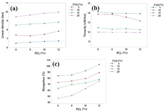 (a) Linear density; (b) tenacity; (c) elongation percentage of developed PVA/PCL fibres.