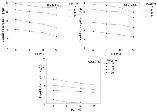 Liquid absorption (g/g) of the fibres increases by increasing the concentration of PVA. When the concentration of PVA increases, OH groups also increase, which attracts the liquid molecules and results in increased liquid absorption. PCL has an indirect impact on the absorption of developed fibres because PCL is hydrophobic, so when the concentration of PCL increases, liquid absorption decreases at a constant concentration of PVA.