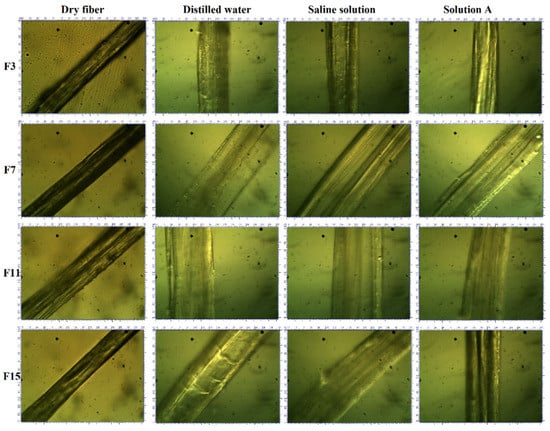 For an ideal wound dressing, excessive exudate management is a very important thing, which is usually examined by the swelling % of the fibres. The swelling % of developed fibres was analysed and calculated in three different above-mentioned solutions by using an optical microscope attached with a digital camera at 40X, which is shown in Figure 5.