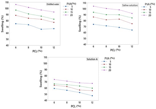 The concentration of PVA and PCL also affected the swelling % of the developed fibres. When the concentration of PVA increased, the swelling % increased due to the hydrophilic nature of PVA. Moreover, with the increase in PVA concentration, hydroxyl groups increased, which resulted in increased swelling % of the developed fibres. On the other hand, PCL had a negative effect on the swelling % of the developed fibres. When the concentration of PCL increased, the swelling % decreased due to the hydrophobic nature of PCL. Overall swelling % increased by increasing the PVA at a constant PCL concentration.