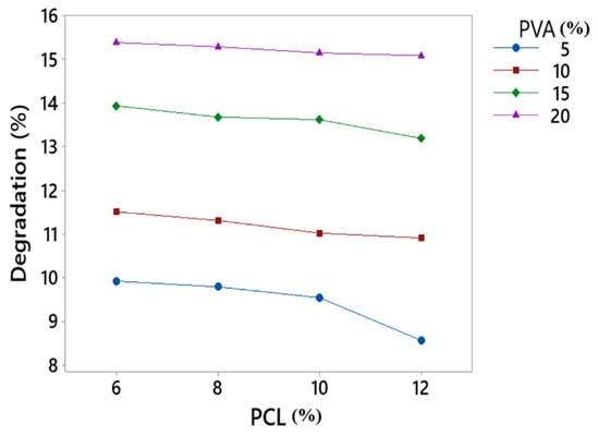 The degradation test was performed to measure the degradation of developed fibres. Figure 7 shows the degradation rate of PVA/PCL fibres. From the results, it was observed that PVA had a direct impact on the degradation of the developed fibres. By increasing the concentration of PVA, the degradation rate increased. PVA is highly soluble in water and has the ability to reduce weight when dissolved in liquid media for many hours. Therefore, when the concentration of PVA increased, the degradation % of the developed fibres also increased. On the other hand, PCL had less effect on degradation % as compared to PVA. When the concentration of PCL increased, degradation increased but to some extent because PCL degraded slowly as compared to PVA.