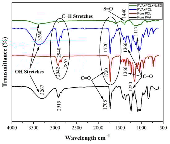 The FTIR spectra of PVA, PCL, PVA/PCL, and drug-containing PVA/PCL fibres were performed to identify the functional groups after the successful incorporation of PVA in PCL as well as drug in PVA/PCL solution. Figure 8 shows the FTIR spectra of PVA, PCL, PVA/PCL, and drug-containing PVA/PCL fibres. Confirmation of different materials used in the development of fibres was carried out by the detection of functional groups having specific peak areas. The characteristics peaks for PVA were depicted at 3267 cm−1, 2915 cm−1, 1708 cm−1, and 1220 cm−1, which confirmed the presence of O–H stretching, C–H stretching, carbonyl group (C=O) stretching, and ester group stretching, respectively []. In the case of PCL, characteristics peaks were depicted at 2942 cm−1, 2865 cm−1, 1720 cm−1, and 1366 cm−1, showing the presence of CH2-asymmetric stretching, CH2 symmetric stretching, carbonyl group stretching, and C–H2 bending vibrations, respectively []. A blend of PVA/PCL fibres showed peaks at 3260 cm−1, 2940 cm−1, 1720 cm−1, and 1117 cm−1, which confirmed the presence of O–H stretching, C–H2 stretching, and C=O carbonyl group stretching and C–H2 bending vibrations, respectively. The characteristic peaks of PVA and PCL in a blend of PVA/PCL fibre confirmed the successful co-extrusion of the two polymers. The peak depicted at 1117 cm−1 confirmed the presence of the C–O ester group in PCL. In the developed PVA/PCL fibre-containing drug, the peak at 1440 cm−1 was related to the asymmetric stretching vibration of the S=O sulphite functional group, which confirmed the presence of NaSD. The FTIR spectra confirmed the successful loading of NaSD (drug) in the developed PVA/PCL fibres.