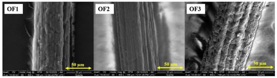 Surface morphologies of drug-loaded fibres OF1, OF2, and OF3 containing 1%, 1.5%, and 2% drug.