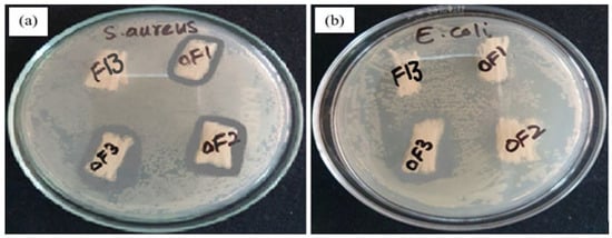 From Figure 10a, it is observed that the zone of inhibition against S. aureus bacterial strains was at its maximum at a 2% drug concentration and a minimum at 1% drug concentration, which showed the presence of the drug in the developed fibres, while no bacterial strains were found in the F13 sample, which was without a drug. OF1, OF2, and OF3 fibres showed a clear inhibition zone with a particular diameter, while the fibres without drug showed bacterial colonies. It may be considered that the drug-containing fibres exhibiting a higher release of the drug showed a bigger inhibition zone as compared to those without drug fibres (F13). As the developed fibres containing the drug exhibited good antibacterial activity against S. aureus that causes wound infections, the developed fibres can be used for preventing infection if used as a dressing either alone or with some supportive dressings.
