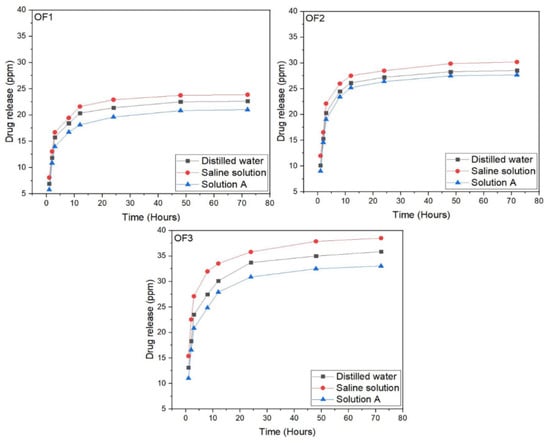 Figure 11 shows the controlled release of the drug (NaSD) from OF1, OF2, and OF3 fibres at different time intervals. From the results, it was seen that the developed optimized fibres showed a maximum release of the drug in the first three hours. This may have been due to the burst release of the drug. The process by which the drug is released involves the dissolution of the drug followed by diffusion to enter the release medium via the swelling grooved structure, and this entire mechanism proceeds at the interphase. The experimentally measured initial rapid release of the drug is known as the burst effect, which occurs due to the large interphase (due to rough fibres’ surfaces) between developed fibres and dissolution medium, which contributes to the dissolution and migration of the drug onto the fibres’ surface and results in the burst release of drug in the first three hours. The slow-release rate of the drug is reached after this burst release of the drug. The non-covalent interaction between the hydrophilic polymer (PVA) and drug (dispersed in fibres’ rough structures) is greatly increased as a consequence of the large surface area. This phenomenon limits the drug’s diffusion and thus contributes to a drop in the rate of drug release.