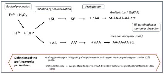 Reaction scheme of grafting versus homopolymerization with Fenton’s reagent and the important result parameters. St = starch, AA = monomer acrylic acid, • = radical state, PAA = polyacrylic acid.