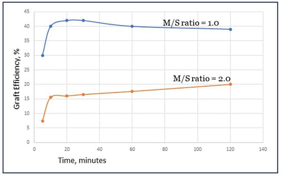 The ratio of OH• radicals that reacts either with starch or with monomer determines the selectivity of the reaction in the early stage. This ‘initial selectivity’ is a matter of statistical probability. The initial selectivity can be influenced by reaction conditions, for example, by the relative concentrations of the AGUs in the starch backbone versus AA present in the vicinity of the activated starch site. However, the initial selectivity may not be the only factor that determines how much grafted starch versus homopolymer is formed at the end of the process. It can be imagined that growing chains of grafted polymer can terminate not only with another growing graft but, alternatively, with a radical end group of a growing homopolymer chain. We can designate the latter as crosstermination. Whether this happens is also a matter of probability, in which a factor like the mobility of the chains in a viscous solution may play a role. GE data that are reported in the literature are usually the values obtained at the end of the reaction. This makes it impossible to know if there is a contribution of crossterminations to the final selectivity. Calculations based on data reported by Witono et al. [] give a rather unique view on how the parameter GE evolves during some typical reactions, as is shown in Figure 4. The calculations are in the Supplementary Material. These data points may have some margin of error since they are derived from combining several experimental data but certainly allow for a trend analysis. In Figure 4, it can be seen that GE rapidly increases in the first minutes of the reaction, then levels off or even slightly decreases. But, in the end, the GE% is always higher than in the first minutes. With Fenton’s initiator, there is also a slow second step of radical creation from ferric ions (Fe3+) [,]. It is uncertain if HO2•, the radicals created in that step, are sufficiently reactive to also start grafting reactions, but that is possible since it has been demonstrated that they do react with starch []. This can be a contribution to higher graft selectivity according to the following. If these radicals indeed do start new grafted chains, that occurs later on in the reaction when part of the initially fed monomer has been consumed. Then, there is a lower actual ratio of monomer to starch (M/S), which is beneficial for graft selectivity, see also Section 4.2. However, when this effect can be considered minor, the course of the GE lines in Figure 4 is mainly caused by crossterminations, and those may indeed contribute to a higher ‘final selectivity’. The increment of GE during the reaction is higher when there is more monomer in the system (at M/S = 2). This is consistent with the effect of statistical probability since, then, there will also be more growing homopolymer chains that a grafted chain can meet to terminate with. The examples in Figure 4 also show that, at the lower M/S ratio of 1.0, GE% is higher both at the end and in the early stage of the reaction. To conclude, crossterminations may compensate to some extent for a low initial selectivity, but the overall grafting result will be better when the selectivity at the initiation stage (initial selectivity) is higher.