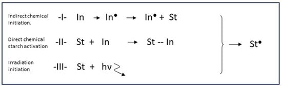 The three principal methods (class I–III) to create starch macroradicals. In = Initiation agent, St = Starch, hv