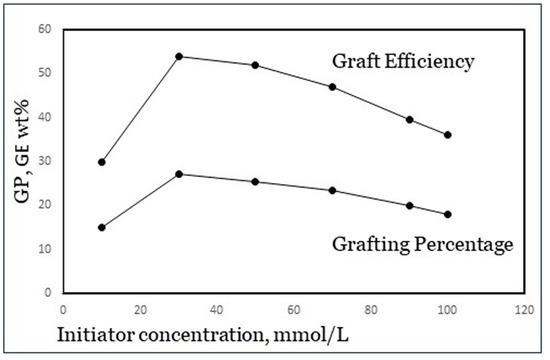 The concentration of initiator usually shows an optimum in both GP and GE. An example is shown in Figure 6, from results published by Khalil et al. [] with potassium persulfate, a class-I initiator, and acrylamide monomer. At low initiator dosage, there are simply not enough radicals to start a polymerization reaction and so an increase in the dosage leads to improvement. However, beyond a certain amount of initiator there are too many radicals, which cause premature terminations as well as increased homopolymer formation. The reason for the latter is not fully clear, but it is speculated that in a further stage of the reaction, there may be a limited number of grafting sites available on the backbone carbohydrate, perhaps due to steric hindrance []. The optimum value is different for each specific grafting system including various starches, so it needs to be determined experimentally for each system. From a published experimental design study [], we concluded that for the grafting system used in our work as mentioned in Section 2, an Fe2+–AGU molar ratio of 1:100 and a 1:10 molar ratio of Fe2+ to H2O2 are near the optimum dosage.