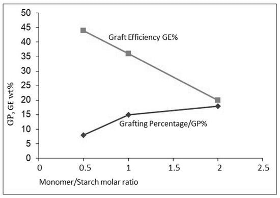 In the grafting system with gelatinized starch, acrylic acid, and Fenton’s initiation, the molar monomer-to-starch ratio (M/S) appears to be more important than the absolute concentrations. Unfortunately, the M/S ratio has an opposite influence on the most important result parameters GP and GE, as shown in Figure 7 (data from Witono []). Such a contrasting influence is seen in other starch grafting literature as well [,]. The optimum will be a trade-off between sufficient functional grafts for an intended application and a low extent of homopolymer production.