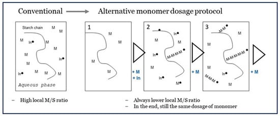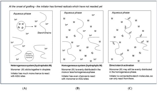 Figure 8 presents ‘artist impressions’, comparing the different reaction environments according to chemical engineering principles. In Figure 8A,B, an indirect initiation agent just has started to create radicals. In the system with monomers that have low solubility in water (Figure 8A), monomer molecules will tend to stick together and form a separate discrete phase in the reactor fluid. The monomer inside these droplets cannot contact the omnipresent initiator. So, these radicals can only react with starch or with the relatively small amount of monomer at the interface or with monomer that diffused out of the discrete phase. This situation favors highly selective starch activation over homopolymer formation.