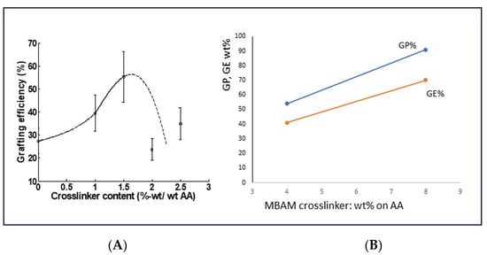 A few data that were obtained in our laboratory may support the idea that the addition of a polymerization crosslinker can lead to the incorporation of non-grafted polymer chains into the grafted network. This is shown in Figure 9. The data in Figure 9A are not really convincing yet, since after an initial increase in GE%, the trend seems to be reversed. However, a few more recent data in Figure 9B show a clear positive effect of increased crosslinker dosage on the grafting result parameters GP and GE. However, this clearly needs more research. Because it is limited to applications of grafted starch in superabsorbents, this potential method to reach a higher final graft selectivity is not explored deeper here.