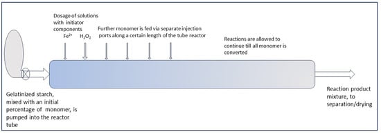 With such reactor concepts, a PR may be feasible for the graft modification of starch in the gelatinized state. The principle of keeping the M/S ratio low by monomer dosage in portions could be translated from a batch to a continuous reactor by substituting the factor time by tuning the distance between monomer injection points. Gradual dosage of monomer can then be brought about by a row of injection ports along the reactor tube, as illustrated by the sketch in Figure 12. This is only conceptual for now, since the gradual/by portion dosing still has to be refined at the lab scale. But perhaps a continuous system may also be suited for such refinement and optimization, which can start with a small-scale reactor. At present, both refinement of the gradual monomer dosage method and upscaling are challenges for future R&D.