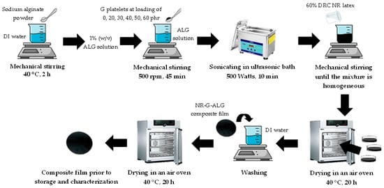 The amount of graphite used in this study varied at 0, 20, 30, 40, 50, and 60 phr, corresponding to weight percentages of the composite film (wt.% of 0, 15.4, 21.4, 26.7, 31.3, and 35.3, respectively. The preparation of composite films was carried out using the latex aqueous microdispersion process, as previously reported by our research group [,,,,]. The alginate solution was prepared by dispersing ALG powder in deionized water. The mixture was mechanically stirred and heated at 40 °C for 2 h until complete dissolution of ALG powder, resulting in a 1% w/v ALG solution. Afterward, graphite was added into 30 mL ALG solution and thoroughly mixed the slurry under mechanical stirring at 500 rpm for 45 min. Subsequently, the slurry was exposed to sonication in ultrasonic cleaner at 500 watts for 10 min to further disperse the filler particles and ensure homogeneity of the mixture. Following this, 5 g of 60% DRC NRL was gradually added into the slurry while continuously mixing by mechanical stirring until the homogenous mixture was obtained. Thereafter, the mixture was poured into a glass Petri dish and dried at 40 °C for 20 h in an air-circulating oven to obtain NR composite films. Afterward, the composite films were washed with deionized water to remove any impurities, followed by drying in an oven at 40 °C to eliminate residual moisture. The composite films were stored in an airtight container prior to characterization. The composite films of NR combined with graphite and ALG were denoted as NR-Gx-ALG, where x represents the content of graphite. For instance, the label NR-G20-ALG indicates the incorporation of 20 phr of graphite in the composite film. The illustrative schematic diagram for the fabrication of NR-G-ALG composite films is shown in Figure 1.
