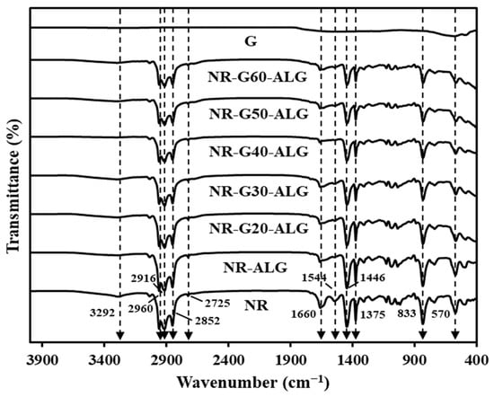The FTIR spectrum for NR, G, and NR composite films is illustrated in Figure 2. The neat NR primarily consists of cis-1,4-polyisoprene, and its spectrum exhibits distinct peaks at specific wavenumbers. The NR spectrum exhibits characteristic peaks at various wavenumbers, each corresponding to specific chemical functional groups, as follows. The stretching vibrations of the -OH group is at 3292 cm−1, the asymmetric stretching vibration of the CH3 group is at 2960 cm−1, the symmetric stretching vibration of the -CH2 group is at 2916 cm−1, the symmetric stretching of -CH2 is at 2852 cm−1, the asymmetrical -CH3 overtone deformation is at 2725 cm−1, and the C=C stretching is at 1660 cm−1 [,,]. The N-H in-plane bending and C-N stretching are attributed to the peptide bonds in proteins, observable at approximately 1541 cm−1 []. The C-H deformation is at 1446 cm−1, the peak at about 1375 cm−1 is ascribed to –CH3 bending, the C-H out-of-plane bending is at 833 cm−1, and the C-C-C in-plane bending is at 570 cm−1 [,,]. In contrast, the spectrum of G lacks significant peaks and remains almost entirely flat due to its high-order structure and chemical inertness. The same observation has been previously reported [,,].