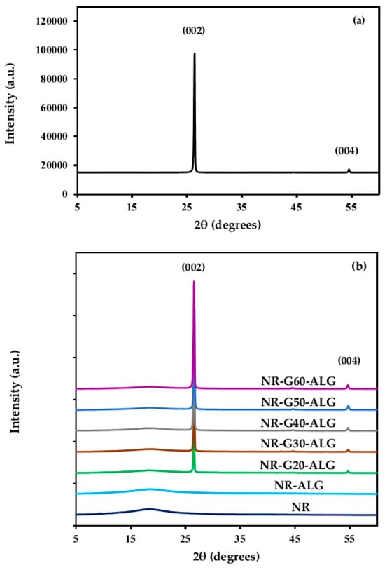 In Figure 5, the XRD diffractograms of NR, G, and NR composite films are illustrated. The XRD diffractogram of G platelets exhibited a distinct, intense peak at 2θ = 26.4° and a minor peak at 54.5°, corresponding to the (002) and (004) crystallographic diffraction planes, confirming the highly ordered hexagonal crystalline lattice of G (JCPDS No. 00-041-1487) [,]. The neat NR film revealed a broad peak centered around at 2θ = 18°, indicating its amorphous polymer chain structure. The NR-G-ALG composite films displayed diffraction peaks corresponding to both NR and G characteristics. The intensity of the G peak increased with increasing G loading. The degree of crystallinity of the G platelets was determined to be 91.1%, where the degrees of crystallinity of NR composite films with G incorporations at 20, 30, 40, 50, and 60 phr were at 27.8%, 30.7%, 36.6%, 46.8%, and 48.3%, respectively. With the integration of G in the NR matrix, the XRD result showed an increase in the crystallinity of NR composite films related to G concentration.