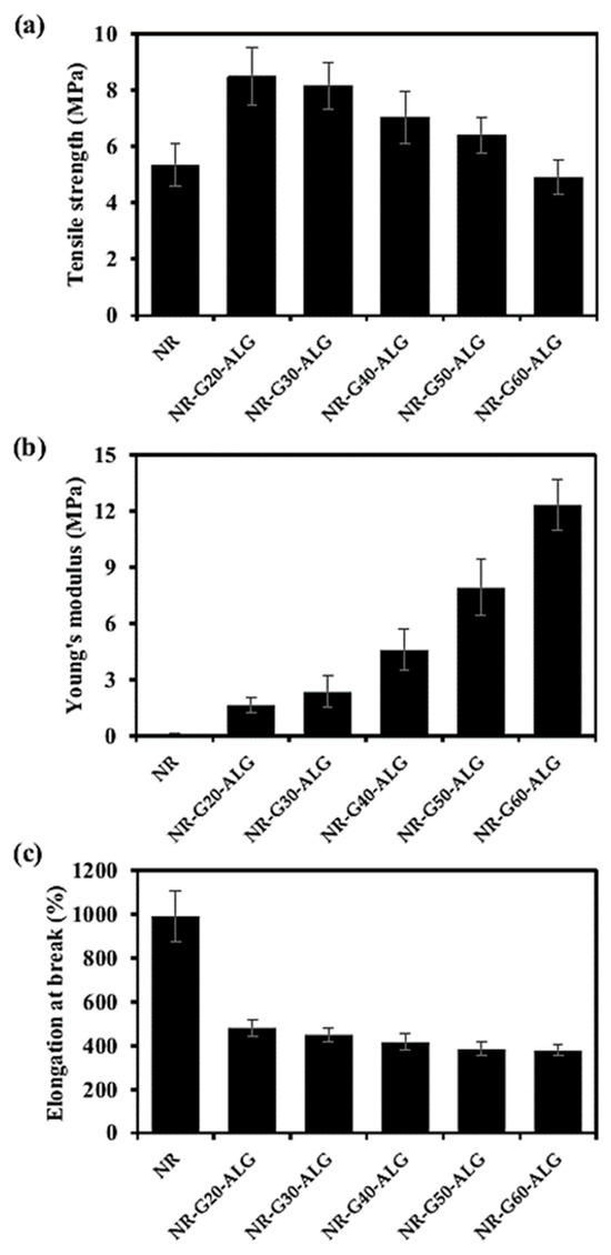 Mechanical properties of NR and NR-G-ALG composite films: (a) tensile strength, (b) Young’s modulus, and (c) elongation at break.