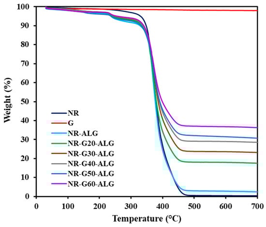 TGA curves of the NR, G, NR-ALG, and NR-G-ALG composite films.