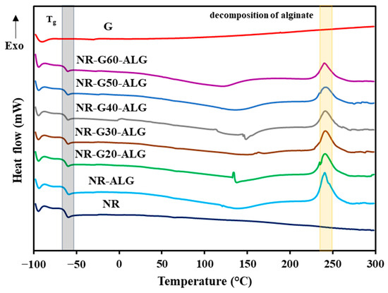 The DSC thermograms presented in Figure 8 depict the thermal characteristics of NR, G, NR-ALG, and NR-G-ALG composite films. The thermogram corresponding to the NR film highlights its amorphous nature, with a glass transition temperature (Tg) of −63.5 °C. This transition temperature marks the point at which the material transforms from a rigid to a more flexible state, reflecting the NR’s inherent properties. In the case of G, there are no distinct thermal peaks observed in its thermogram. The absence of significant peaks in the thermogram points to the exceptional thermal stability exhibited by G. Notably, upon analyzing the thermograms of all NR-G-ALG composite films, no significant change in Tg was observed. The broad endothermic peaks observed in the temperature range of 80–150 °C were assigned to the evaporation of water molecules associated with the ALG polymer []. Additionally, the exothermic peaks, centered at around 240 °C, were attributed to the decomposition of the alginate polymers, resulting in the formation of carbonized residue [].