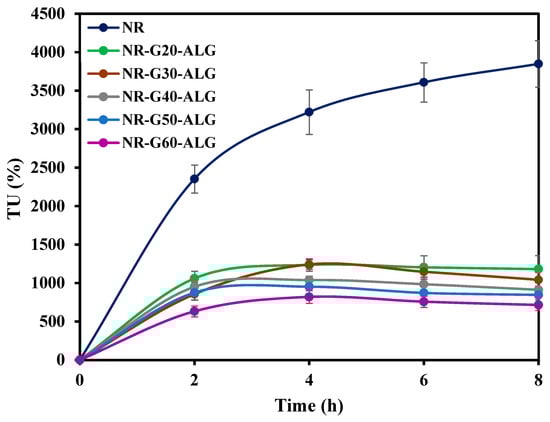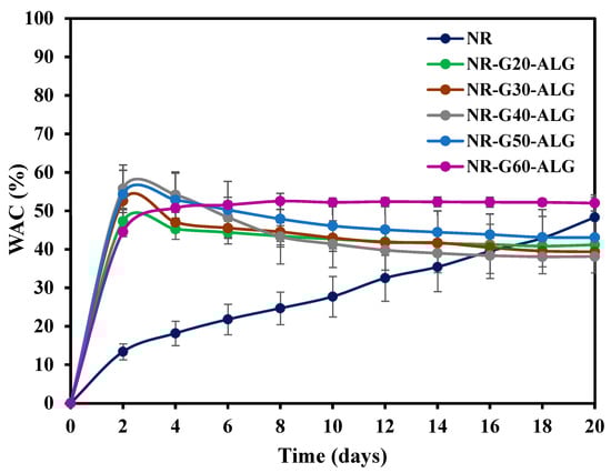 The water absorption capacity (WAC) of NR and NR composite films is presented in Figure 9. In the case of the neat NR film, a gradual increase in WAC is observed over a 20-day period. However, with the addition of ALG, a polar molecule known for its hydrophilic and water-retention properties, a remarkable change in the water affinity of the composite films is evident. Therefore, the initial water uptake rate of NR composite films in the first 2 days is much higher than that of neat NR. After 2 days of water immersion, the NR-G-ALG films exhibited nearly constant levels of water absorption.