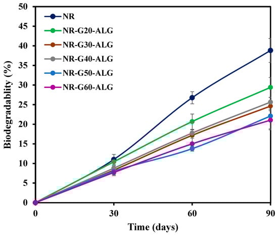 Biodegradability is a crucial property of environmentally friendly materials. Biodegradation in soil is driven by microorganisms that break down complex organic compounds into simpler molecules. Ultimately, this process results in the production of water, carbon dioxide (under aerobic conditions), or methane (under anaerobic conditions) [,]. Figure 11 illustrates the relationship between biodegradability and the duration of burial. The NR and NR composite films underwent a 90-day burial period. Because of its intrinsic amorphous nature, NR readily accommodates microorganisms within its structure. NR film is a bio-based and biodegradable product, which could be broken down by numerous bacteria and fungi []. Following over 90 days of burial, the neat NR film exhibited a progressive increase in biodegradation, reaching a value of 38.8%.