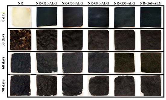 With the incorporation of G platelets, which are a highly stable carbon allotrope known for its crystallinity and non-toxic nature in the environment, the weight loss of NR-G-ALG composite films was significantly lower compared to that of the neat NR film. However, the weight loss rate also increased over time. After 90 days of burial, NR-G60-ALG demonstrated the lowest weight loss at 21.0%, whereas NR-G20-ALG exhibited higher weight loss at 29.4%. The incorporation of G into the composite films is believed to contribute to an increase in their degree of crystallinity. In general, crystalline polymer tends to have denser molecular packing, thus slowing down its rate of breakdown [].