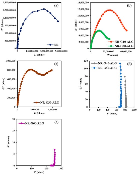 Electrochemical impedance spectroscopy (EIS) assessed the electrical conductivity of NR and NR composite films across a frequency range from 105 Hz to 1 Hz. NR-G10-ALG films were intentionally fabricated by using G filler for improved electrically conductive properties. The Nyquist plots in Figure 13 depict the relationship between real and imaginary impedances of fabricated NR and NR composite films, exhibiting behavior dependent on G loading content. Smaller semicircle diameters indicate higher electrical conductivity due to lower impedance magnitude [].