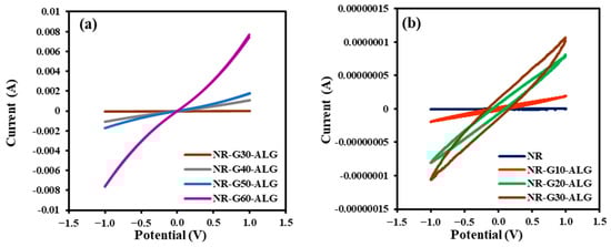 For CV measurements (Figure 16), the NR and NR composite films were assessed within a potential range of −1.0 V to 1.0 V. In NR and NR-G-ALG composites with low G loading (up to 30 phr), the closed-loop rectangular shape in the CV graphs suggests non-linear electrical behavior, resembling capacitance behavior. This behavior may be linked to incomplete conductive pathways, resulting in a non-uniform electrical response. However, as the G loading increases, there is a noticeable increase in the slope of the graphs. Beyond the percolation threshold, the observed linear-like behavior in the CV graphs may indicate the establishment of a continuous conductive network within the composite. This network could facilitate efficient electron transport, leading to more linear and predictable electrical responses.