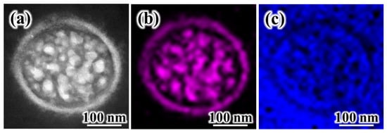 TEM analysis was carried out using specimens prepared by the cryo-ultramicrotome method in order to establish the complex internal morphology of SiO2/PVdF fiber. Figure 2a shows the high-angle angular dark field (HAADF) image of the SiO2/PVdF fiber cross-section. The SiO2/PVdF fiber comprised a thin skin layer, a core bulk, and a few spots inside the bulk. Figure 2b,c show the elemental mapping images of the SiO2/PVdF fiber. Although the carbon mapping of the core bulk did not clearly clarify the elemental distribution of the exact point owing to the inherently restricted resolution of the scanning TEM mode, we concluded that a clear hollow was prominent and corresponded to SiO2. These revealed the elemental composition of the SiO2/PVdF fiber in which the thin skin layer and nanofibrils inside the core bulk comprised SiO2- and PVdF-occupied core bulks. This unique morphology, a skin-layered multicore–shell fiber, was named. Moreover, the dark domains inside the bulk were grown along the direction of the elongation of the electrospun fibers (Figure 3).
