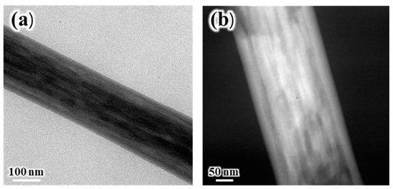 Longitudinal section of the TEM images of the SiO2/PVdF (5:5 wt. ratio) electrospun fiber. The specimen employed for the TEM analysis was prepared by the microtome method under the cryo condition: (a) bright-field image and (b) high-angle angular dark field (HAADF) image.