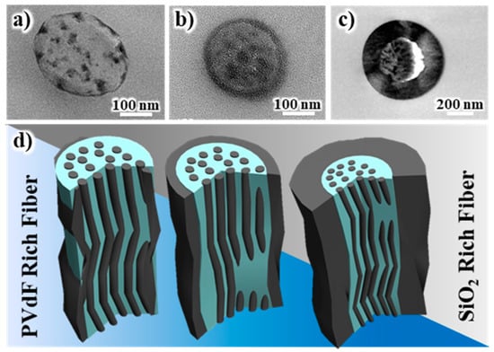 Cross-sectional TEM bright-field images of the readily tunable skin-layered multicore–shell SiO2/PVdF electrospun. (a) SiO2/PVdF (1:9 wt. ratio), (b) SiO2/PVdF (3:7 wt. ratio), (c) SiO2/PVdF (5:5 wt. ratio). (d) Schematic of those fibers, including their internal morphologies.