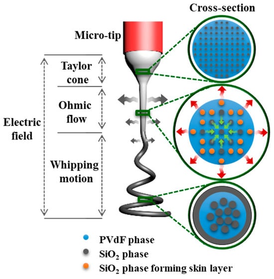 Schematic of the SiO2/PVdF electrospinning procedure and cross-section of each stage of the Taylor cone, Ohmic flow, and whipping motion.