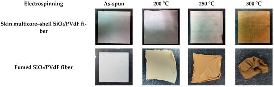 Photos of the membranes exposed to temperatures of 200 °C, 250 °C, and 300 °C for 2 h and the as-spun membrane (SiO2/PVdF = 3:7 wt. ratio).