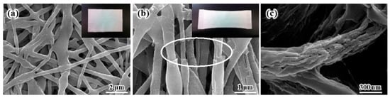 Figure 4a shows the SEM images recorded after the calcination of an as-electrospun composite membrane at 700 °C. The electrospun pure PVdF nanofiber generally changed into granular-type carbon through high-temperature carbonization []. As shown in Figure 4a, the skin and nanofibrillar structures, which were assumed to be the SiO2 component, were observed after calcination at 700 °C, indicating that the electrospun SiO2/PVdF blend nanofibers comprised a SiO2-based skin structure and a nanofibrillar structure. The nanostructures, including the skin multicore–shell nanostructure, the mechanism of their formation, and the thermal stabilities of the electrospun SiO2/PVdF composite membranes with several blend ratios of SiO2/PVdF, were discussed in other papers [,]. Additionally, the thickness of SiO2 comprising the thin skin layer could be readily tunable depending on the weight proportion of SiO2 and PVdF.
